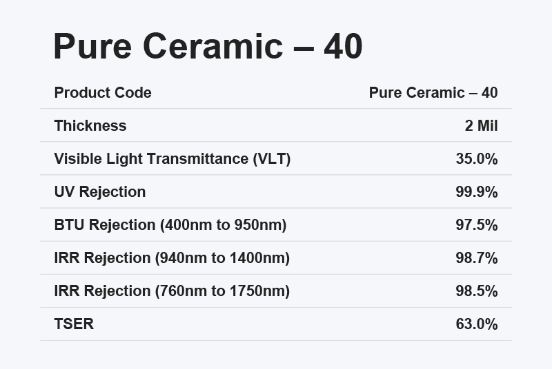 Feynlab’s Pure Ceramic Window Film is engineered to deliver reliable heat control, visual comfort, and long-term performance for both residential and commercial buildings. Available in Pure Ceramic 40 and Pure Ceramic 50, this series offers different light transmission options while maintaining superior infrared heat rejection.